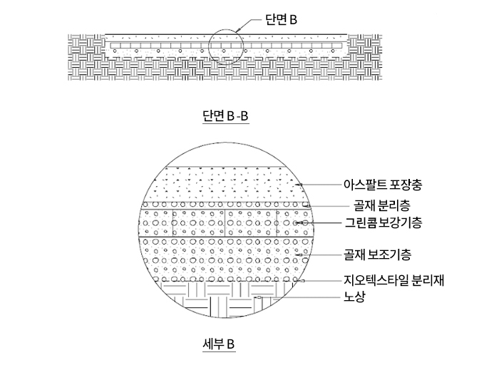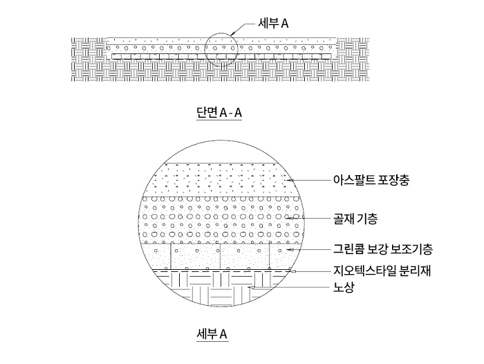 기층 하부를 보강하여 부등침하를 방지하고 지지력을 개선하는 그린콤 공법입니다.