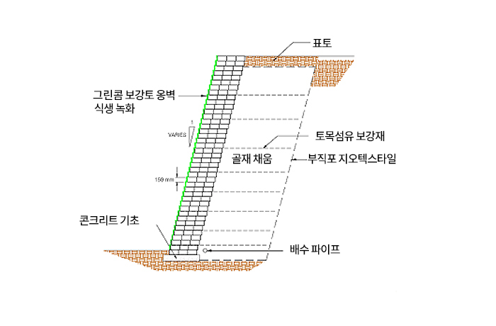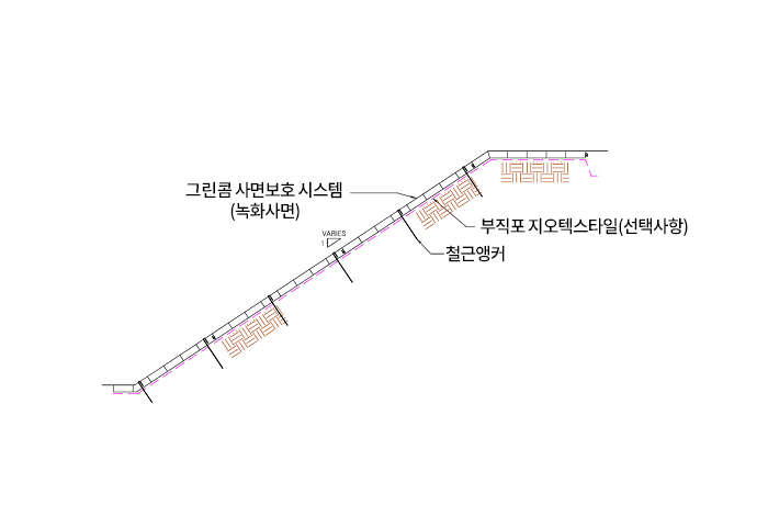 집중강우로 인한 침식을 막기 위해 식생매트를 함께 적용함으로써 토사 유실을 줄이고 침식방지층을 형성해 전체적인 사면 안정성을 높인다.