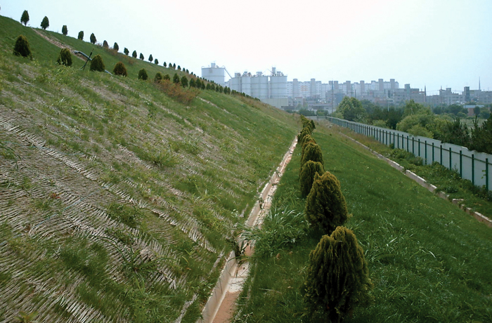 매립장 최종 복토층의 식생기반층 침식방지와 부등침하방지를 위한 효율적인 공법입니다.