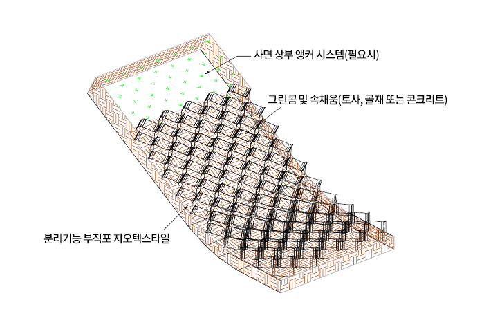 급경사면의 콘크리트 또는 골재 피복 사면에도 적용 가능하며, 그린콤은 거푸집 및 신축이음 역할을 수행해 지반 움직임에 순응하고 균열을 조절하는 유연한 보강층을 형성한다.